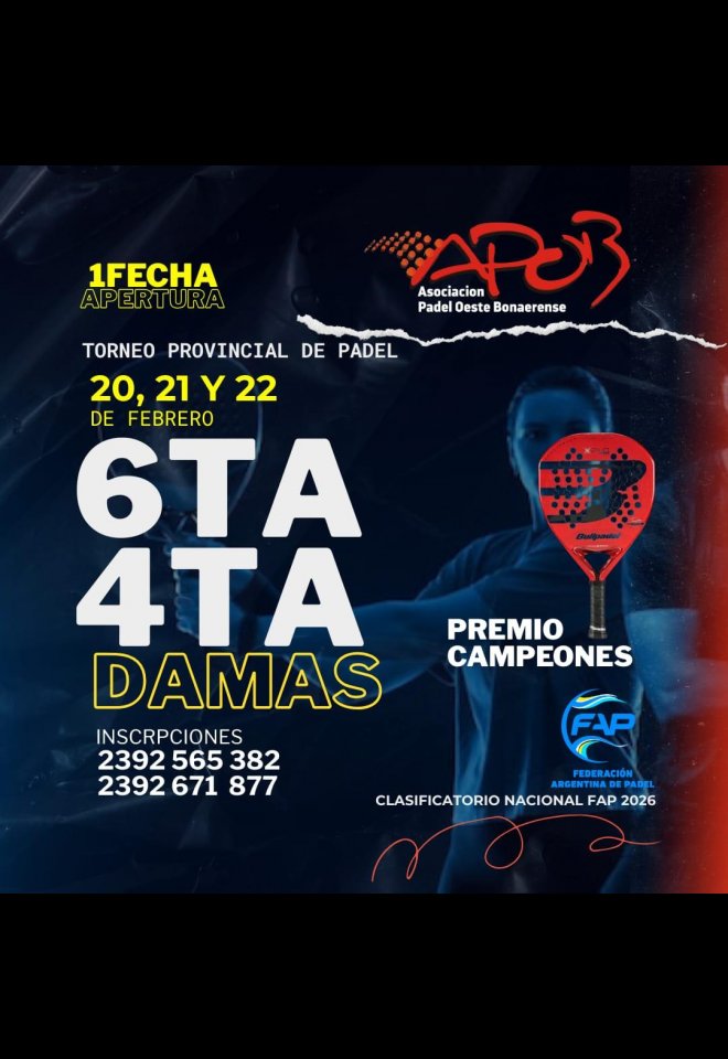 »» Evento: 6TA Y 4TA CAT DAMAS APOB 2026 1RA FECHA APERTURA »» Localidad: Trenque Lauquen »» Fechas: 20/02/2026 al 22/02/2026