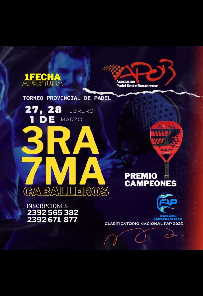 »» Evento: 7MA Y 3RA CATEG HOMBRES APOB 2026 1RA FECHA APERTURA »» Localidad: Trenque Lauquen »» Fechas: 27/02/2026 al 01/03/2026